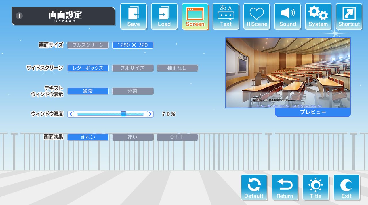 『ハッピーウィークエンド』の画面設定です。『画面サイズ』を変えたい方は結構多いと思うので、使う方も多い設定かなと思います。